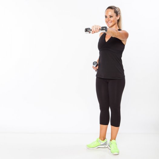 А. Держа пару гантелей на бедрах с локтями за телом. Держа пятки прижатыми друг к другу, выкидывайте левую руку в переднюю часть, ладонью вниз.