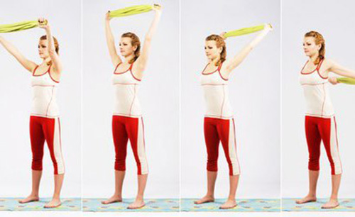 Для расправленных плеч. Возьмите полотенце, сверните в жгут. Выпрямите спину, стопы поставьте на ширину плеч. Вытяните руки перед собой и натяните полотенце так, чтобы руки были разведены как можно шире. Поднимите руки и заведите назад так далеко, как можете. Досчитайте до пяти. Верните в исходное положение. Повторите 5 раз.