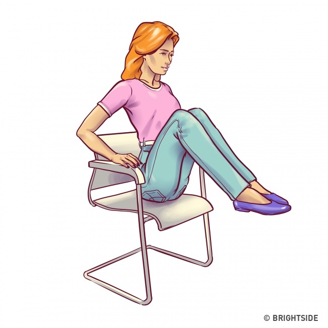 Сжигает жир быстро. Прорабатывает мышцы живота, спины и плеч. Убедитесь, что ваш стул не является подвижным.