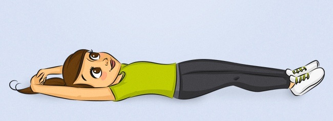 Лежать на спине. Перекрестите пальцы, вытяните руки так далеко от ваших плеч, насколько сможете. Следите за пальцами.