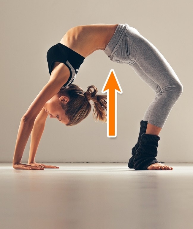 Ложитесь на спину, согнув ноги в коленях. Прижмите ладони к полу над головой. Затем начните поднимать бедра и плечи, сгибая спину. Удерживайте максимальное положение несколько секунд. Затем осторожно вернитесь в исходное положение, опустив спину к полу. Выполните 2 подхода по 5 секунд.