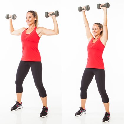 Станьте с гантелями над головой, и держите локти близко. Поднимайте вес вверх.