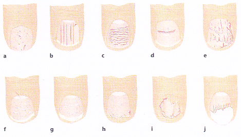 — Белые пятна на ногтях: маленькие белые линии на ногтях и изменение цвета ногтей, которые в конечном итоге становятся полностью белыми.