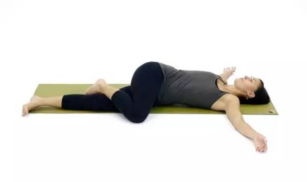 Опять же, расположите себя на спине и подкрепите колени. Позвольте коленям опуститься до упора вправо. Для большей стабильности держите левое бедро правой рукой.