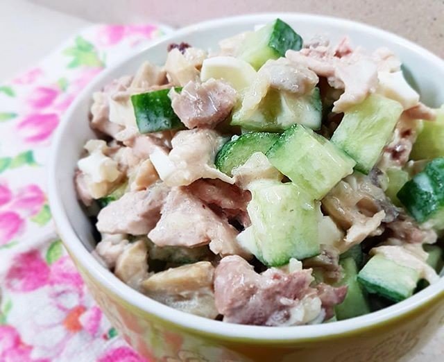 Яйцо сварить в крутую, курицу отвариваем до готовности. Остужаем. Огурец режем на кубики. Шампиньоны нарезаем на кусочки. Курицу очищаем от кожи и жира, нарезаем мелко. Яйцо крошим мелко. Все смешиваем и заправляем йогуртом, солим.