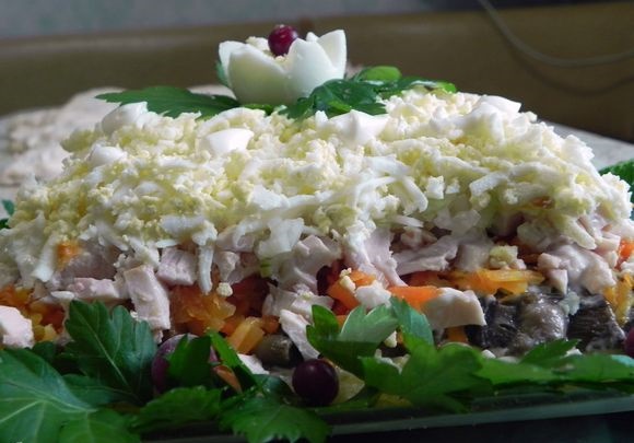 Выкладывать всё в следующей последовательности: чернослив, курица, лук с грибами, яйца (на терке), огурец (потереть на терке).