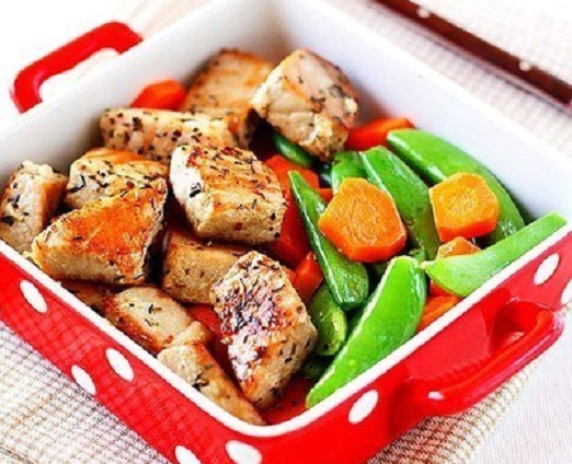 Филе рыбы нарезать небольшими кусочками. Морковь нарезать и отварить до готовности. Горошек опустить в кипящую воду на 1 минуту, после окунуть в холодную воду и откинуть на сито.