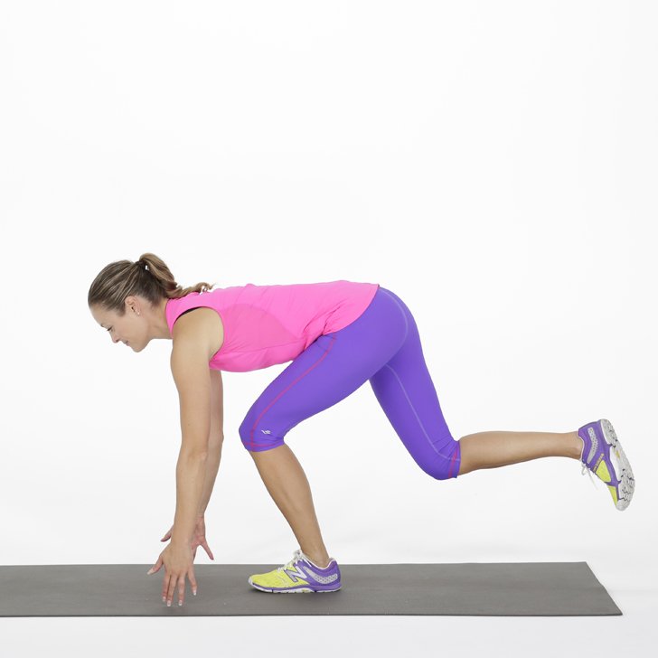 - Держите свой позвоночник прямо, вытянитесь вперед, согнув левое колено и прикоснувшись пальцами рук к полу на несколько дюймов перед пальцами ног. Держите ваш пресс в напряжении, чтобы стабилизировать туловище. Ваша правая нога пойдет позади вас, чтобы помочь вам сбалансироваться.