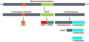 В зависимости от места синтеза (передняя либо средняя доля гипофиза) и от конкретных стимулов ПОМК подвергается следующим преобразованиям: