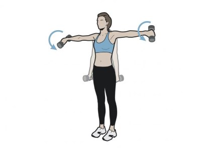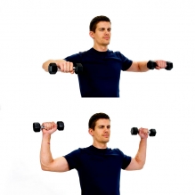 С помощью гантели в каждой руке поворачивайте руки внутри, так чтоб ваши пальцы указывали на пол. Поднимите обе руки с боков, удерживая пальцы, указывающие вниз все время, пока гантели не достигнут уровня чуть ниже плеч.