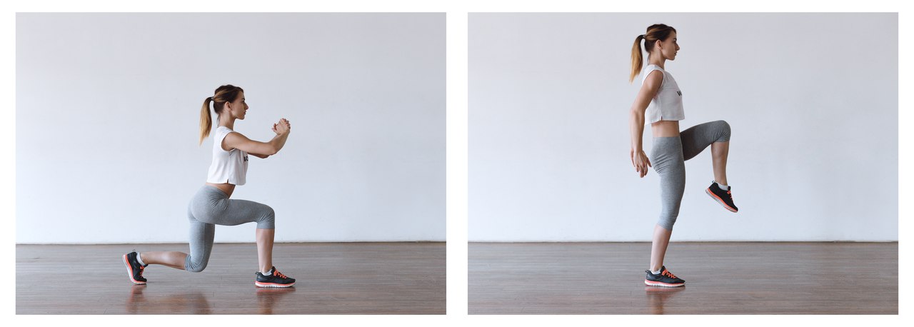 5) Выпад с подъемом ногиНоги на ширине таза. Сделайте выпад назад, а затем поднимите бедро до параллели с полом. Следите за тем, чтобы колено передней ноги не выходило за носок. Сделайте 3 подхода по 10-15 раз на каждую ногу.