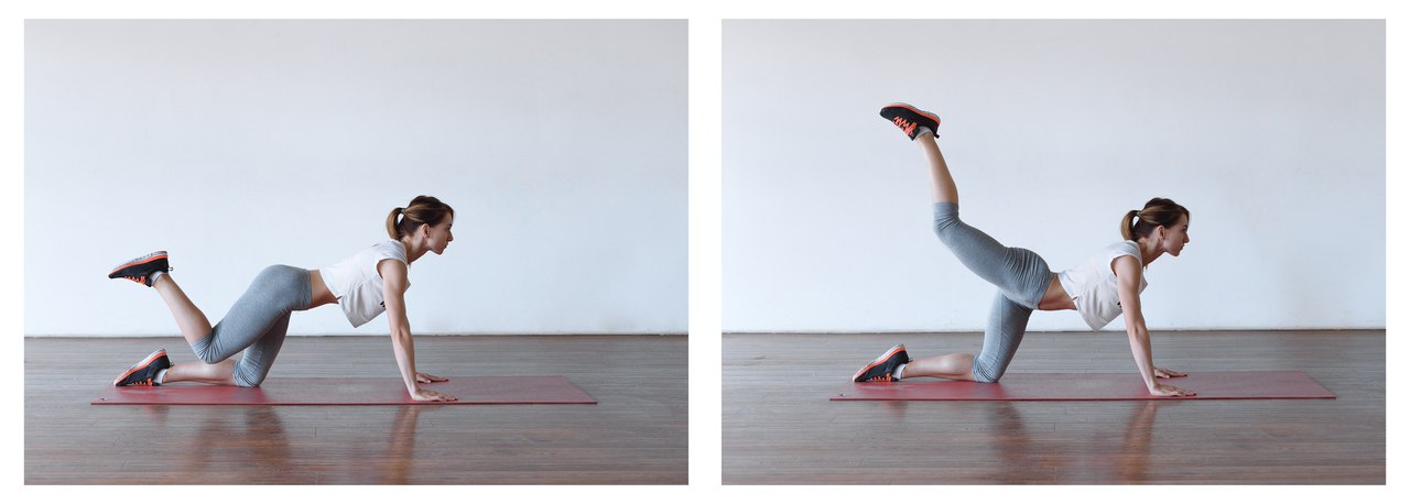 4) Подъем согнутой в колене ногиВстаньте на колени. Ладони поставьте на пол под плечевыми суставами. Согнутую в колене ногу поднимите так, чтобы она стала параллельной полу. Поднимайте ногу выше параллели, стараясь как бы коснуться пяткой потолка. Ногу при этом все время держите на весу и не опускайте ниже начального положения. Сделайте 3 подхода по 15-20 раз на каждую ногу.