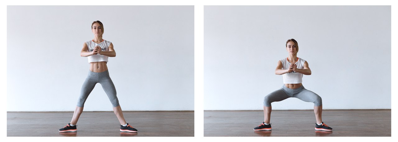 1) Приседания с широко расставленными ногамиСледите за тем, чтобы спина была прямой. Зафиксируйте ступни чуть шире плеч, носки и колени должны должны быть сонаправлены. Спина ровная. Выполните 20 пружинящих движений, опуская таз до параллели с полом. Сделайте 3 подхода