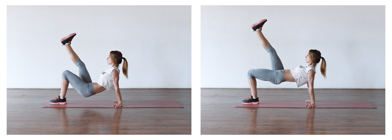 2) Подъем прямой ногиПоставьте ладони на пол под плечами. Одну ногу поднимите вверх, плавно опускайте и поднимайте таз. Спину при этом держите ровно. Сделайте 3 подхода по 15-20 подъёмов на каждую ногу.