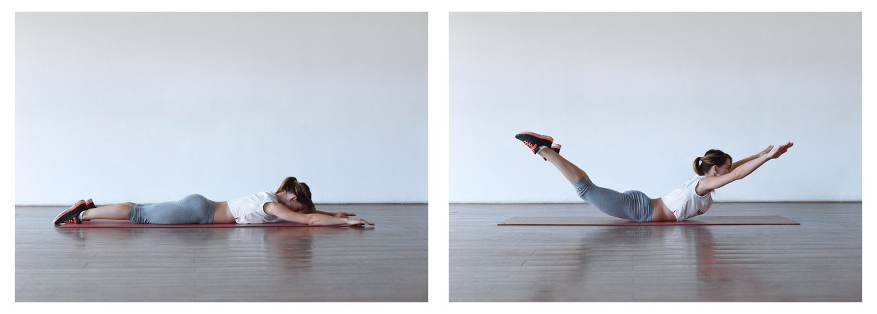 3) Гиперэкстензия – одновременный подъем рук и ногЛягте на живот. Руки вытяните вперёд. Одновременно поднимите руки и ноги. Задержитесь в таком положении на 2 секунды, затем вернитесь в исходное положение. Вы должны чувствовать, как напрягаются ягодичные мышцы. Сделайте 3 подхода по 15-20 раз.