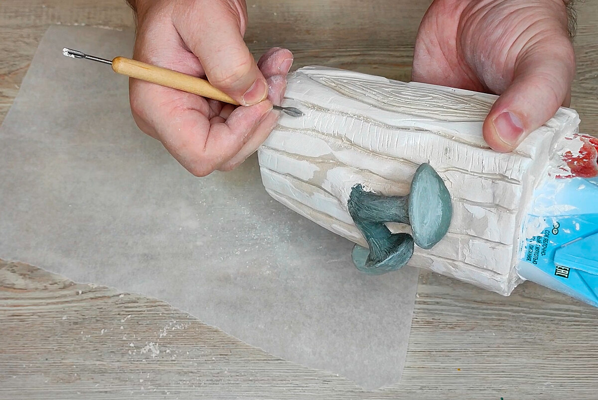 Глиной для лепки слепил грибы, бороздки сделал с помощью зубочистки.