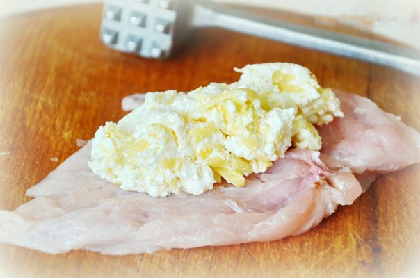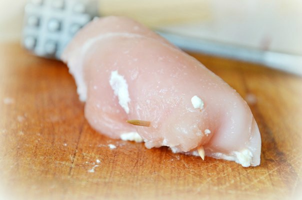 Филе надрезать и отбить с двух сторон, чтобы получилась пластинка побольше. Солим по вкусу.