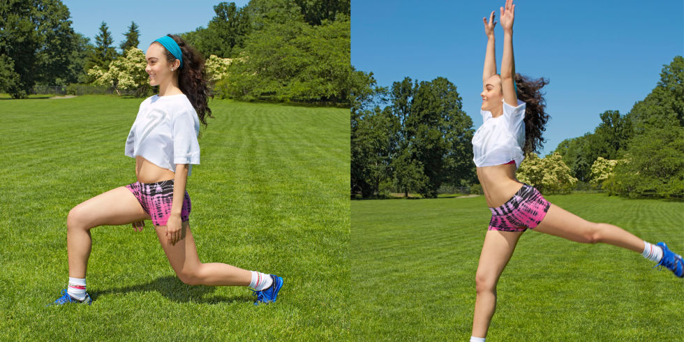 2. Прыгайте, в результате чего ваши руки будут над головой и левая нога позади вас. Приземлитесь в положение выпада. Выполните 8 повторений на одной стороне и переключитесь на другую. 3 подхода.