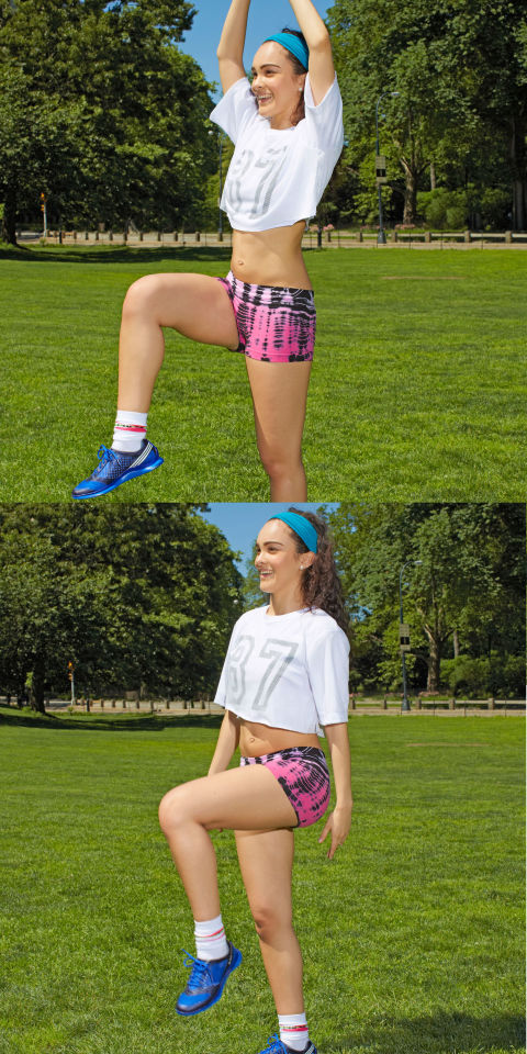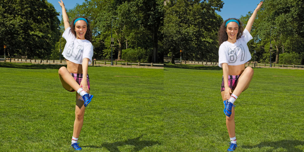 2. Бросайте руки вниз к бокам и левое колено вверх. Продолжайте чередуя колени (подобрать темп, так, как будто вы на пробежк) в течение 30 секунд, а затем отдохните в течение 15 секунд. 3 подхода.