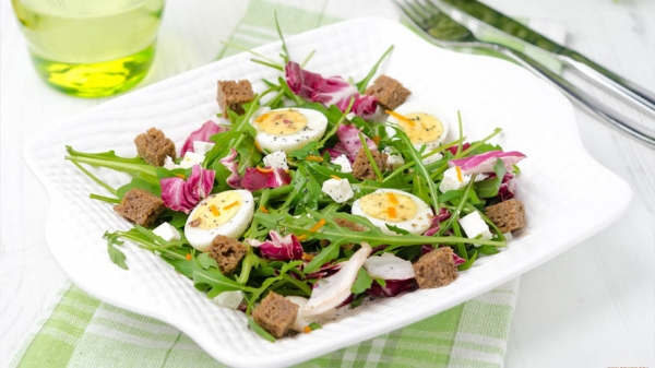 Отвариваем креветки в подсоленной воде. Вареные яйца режем четвертинками, помидоры режем половинками, креветки кладем в салат целиком. Листья салата рвем на небольшие куски, сыр режем на кубики, зелень нарезаем. Поперчить и посолить, заправляем маслом. Не перемешивать!