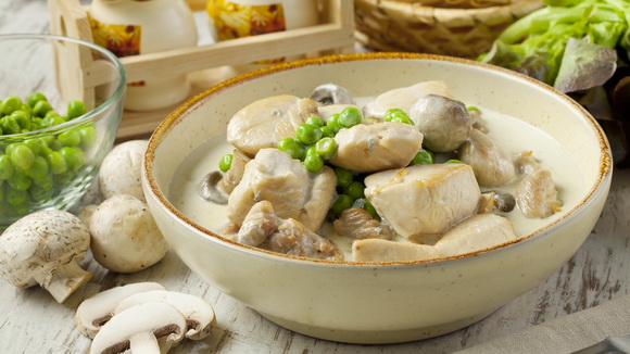 Лук и шампиньоны нарезаем и обжарить в оливковом масле. Курицу, нарезанную кубиками добавляем к луку. Добавляем кефир. Тушим 10 минут, накрыв крышкой и периодически помешивая. Посыпаем укропом.