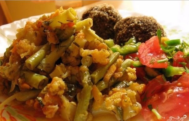 Добавляем фасоль и помидор, нарезанный на кусочки. Доливаем немного воды, и тушим до готовности. Добавляем специи по вкусу.