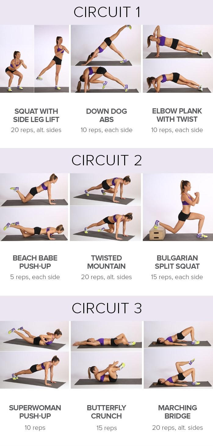 Инструкция: разогреться пять минут с кардио, затем повторить три схемы по три упражнения. По окончании — пять минут растяжения.