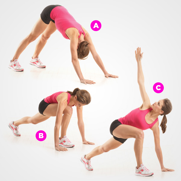 Задержитесь в этом положении в течение трех глубоких вдохов. Шаг назад, в исходное нижнее положение собаки. Повторите положение с другой стороны.