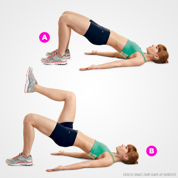 Лежите на спине с согнутыми коленями, ноги на полу и бедра подняты. Поднимите правое колено к груди. Удерживайте в течение двух секунд, затем вернитесь в исходное положение. Выполните упражнение с другим коленом также.
