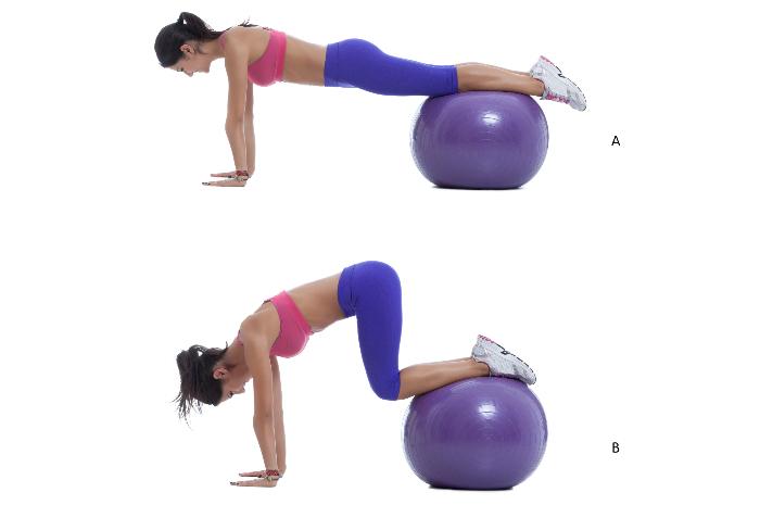 Лечь, положить ноги на мяч, отпустить таз и начать делать скрутки. Важно найти нейтральную позицию позвоночника, чтобы избежать болей в спине.