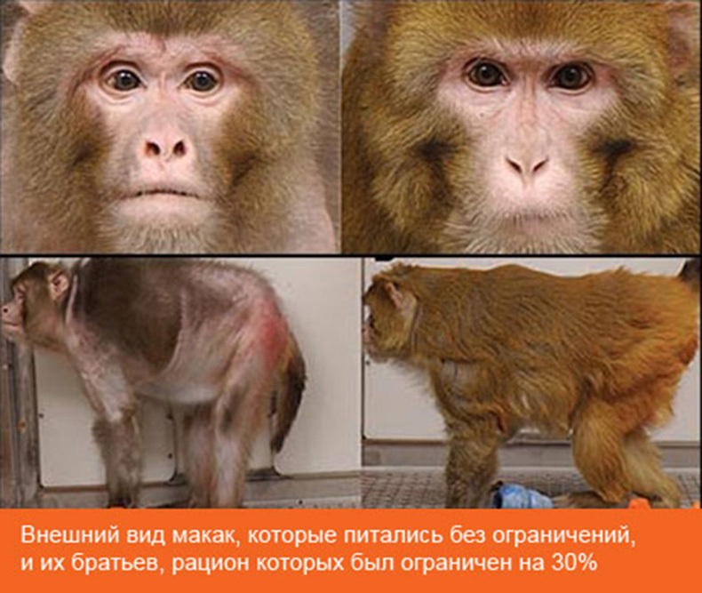 Следующие на очереди были 20 взрослых приматов, исследование которых началось в 1989 году и продолжается по сей день. 11-ти из них уменьшили паек на 30% и стали наблюдать за результатами, другие же кушали как обычно. В 2009 году 80% из приматов-малоедов были еще живы, в то время как половина особей с контрольной группы «обжор» уже погибли от старости и сопутствующих ей болячек. Внешний вид приматов тоже говорит о многом: