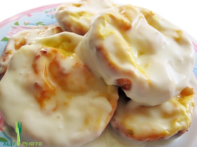 Горячие творожники обильно обмазываем сметаной, сложить в кастрюльку и накрываем крышкой. Даем постоять некоторое время, чтобы пропитались.