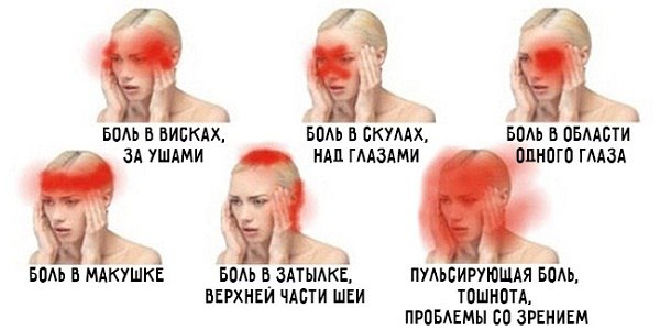 — Мигрени характерна пульсирующая боль, тошнота, изменения в зрении.