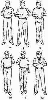 (рис. 13– 17). Сложите ладони перед грудью пальцами вверх и выполняйте ими маятниковые движения влево и вправо в среднем или медленном темпе (кончики пальцев не должны подниматься выше подбородка), сопровождая эти движения легкими наклонами корпуса в стороны. Во время выполнения упражнения можно медленно прогуливаться, шагать на месте или вообще не двигаться. При этом не следует забывать о координации движений рук и ног. Выполняя упражнение сидя или лежа, руководствуйтесь требованиями к упражнению 2.