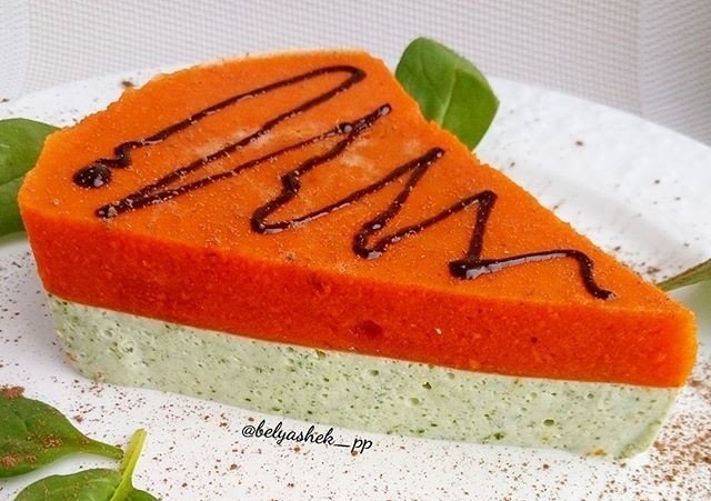 Тыкву нарезаем кусочками и готовим в микроволновке 10 минут при полной мощности до мягкости! Желатин замочить, нагреть, чтобы он растворился, но не кипятить! Творог, ванилин, сахарозаменитель, шпинат, 1/2 желатина взбить в блендере и разлить в формочки и ставим в морозилку! Тыкву, корицу, оставшийся желатин в блендере взбиваем и выливаем на застывший шпинатный слой и снова убираем в морозилку! Через 10 минут готово!