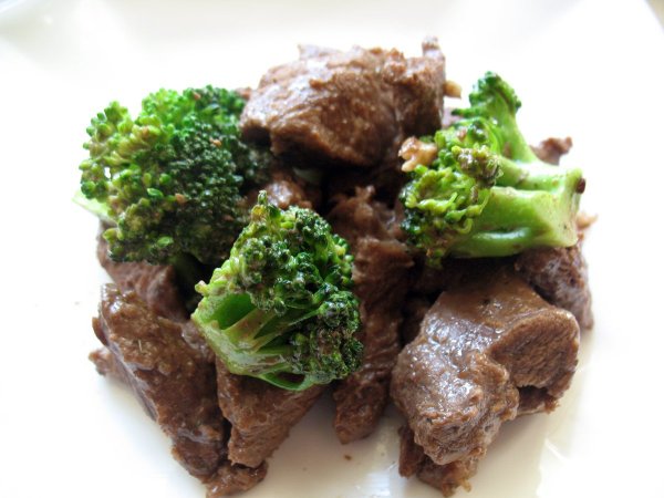 Брокколи отвариваем в подсоленной воде, и слегка обжариваем на сковороде с 1.ч. ложкой масла. Мясо нарезать, выложить на тарелку, а рядом выложить брокколи.