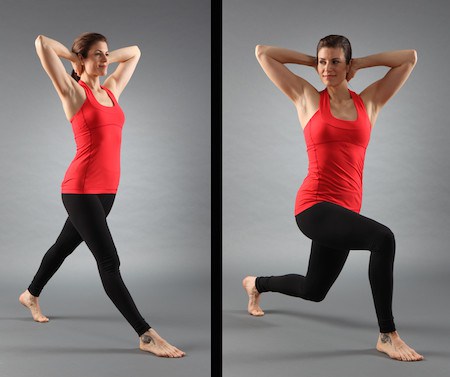 Предположим, что начальная позиция, правой ногой шагнуть вперед и положить руки за голову. Шаг немного назад с левой ноги. Выдохните и согните оба колена, в то же время поворачивая тело настолько, насколько сможете, вправо. Вдохните, выпрямите ноги и туловище, вернув его в исходное положение. Это одно повторение.