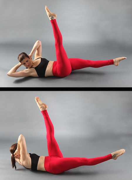 Ложитесь на спину, руки за голову и поднимите корпус с пола. Поднимите левую ногу вверх, поверните талию так, чтобы ваш правый локоть был ближе к левому колену. Повторите с правой ногой. Сделайте два набора из десяти повторений.