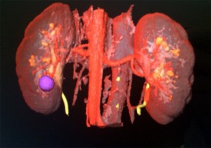 Сначала врачи получают 3D модель почки и точно видят место, где находится злокачественная опухоль (на рисунке она фиолетового цвета).