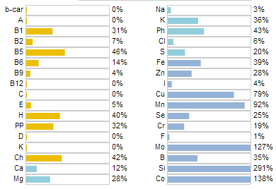 4 место — Гороховая — (самая оптимальная) — 80 ккал в 100 гр. В гороховой каше (сейчас речь о сухом горохе, а не готовом пюре) — целых 20,5 граммов белка (больше, чем в мясе), почти половина дневной дозы витамина В5, почти тройная суточная доза кремния и почти суточная — магния, не говоря уже о прочих нутриентах (%% от суточной нормы в 100 граммах):