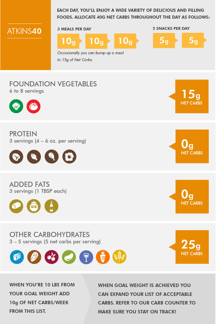 Начните с 40 граммов чистых углеводов углеводов в день. Чистые углеводы представляют собой общее содержание углеводов в пище за вычетом содержания волокна и сахарных спиртов (если в продукте).