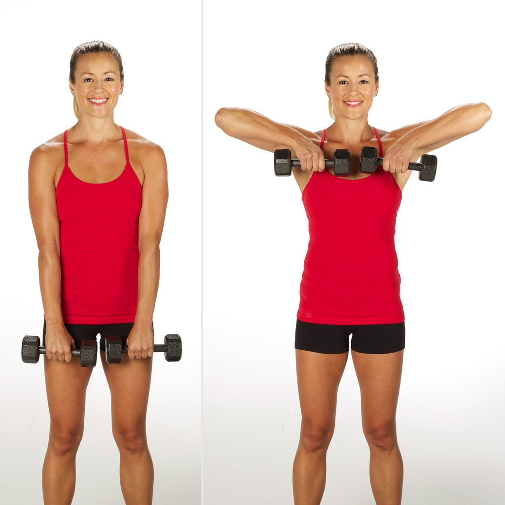 Держа локти близко к бокам, медленно поднимите гантели к груди.