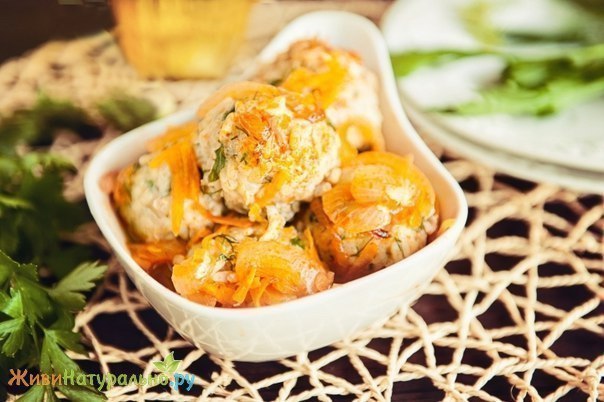 Натереть морковку, мелко порезать луковицу, уложить сверху на тефтели.
