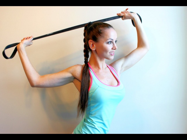 4)Подъём рук с эспандером. Упражнение можно выполнять стоя, на коленях или сидя в зависимости от жесткости эспандера. На выдохе поднимите руки в стороны немного выше уровня плеч. Опустите руки в исходное положение на вдохе.