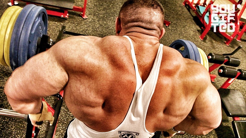 Начинается тренировка спины Алексея Лесукова с вертикальной тяги в тренажере. Здесь наибольшую нагрузку получают широчайшие мышцы, большая и малая круглая. Самое главное для достижения результата, по мнению Алексея Лесукова — это правильная техника и умеренный вес.