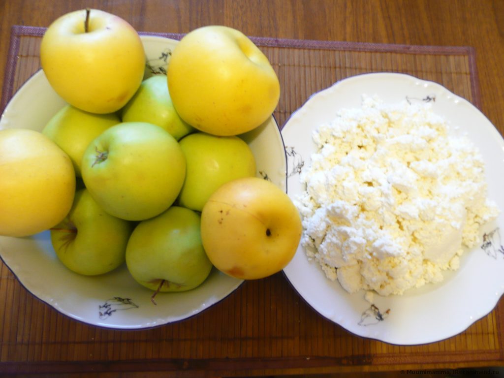 — Нам понадобится нежирный творог (около 300 грамм) и 5 зеленых яблок.