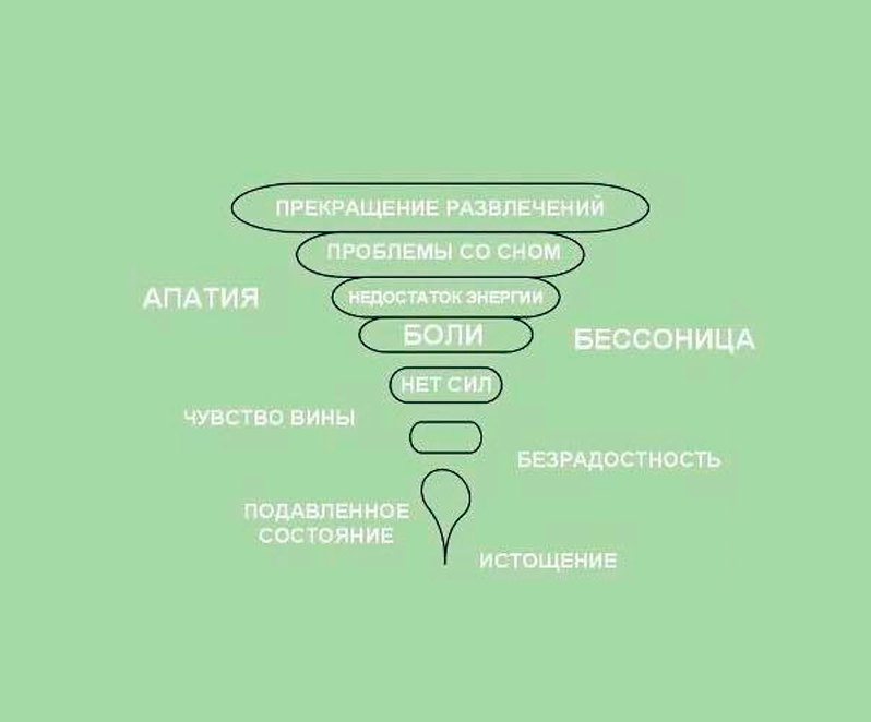 И тогда новый круг — энергии все меньше, нужно оставлять самое важное. Это опять минус “чепуха” и удовольствия. Ведь это может ждать… И новый виток потери сил. И так до самого дна….