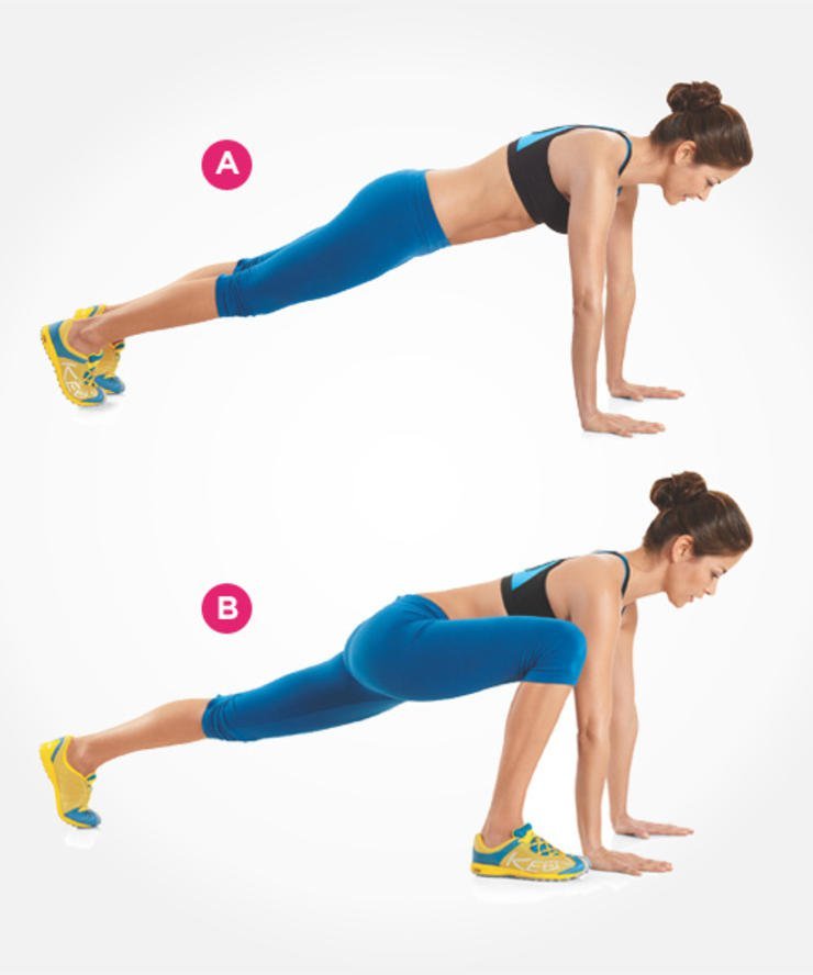 Теперь исходное положение для нас – поза «Планка». Ноги вместе. Сделайте шаг вперед левой ногой. Затем вернитесь в исходное положение. И повторите правой ногой. В общей сложности это – 1 раз. Сделать вам надо 20 – 30 повторов. Данное упражнение направленно на развитие силы и мышц верхней части тела.