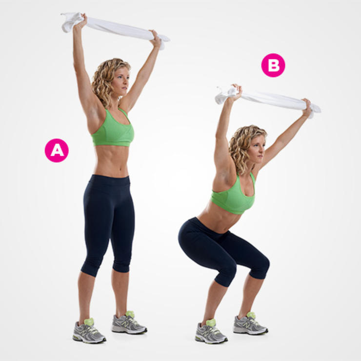 Возьмите в руки полотенце и поднимите над головой. Это позволит держать плечи на одном уровне. Запомните, плечи должны быть опущены. Ноги на ширине плеч, и начинаем делать приседания до уровня стула. Спина прямая. Стараемся не наклоняться сильно вперед. Сделайте 10 -15 повторов. В этом упражнении мы работаем над верхней частью спины, ногами и развиваем выносливость. Не забывайте правильно дышать.